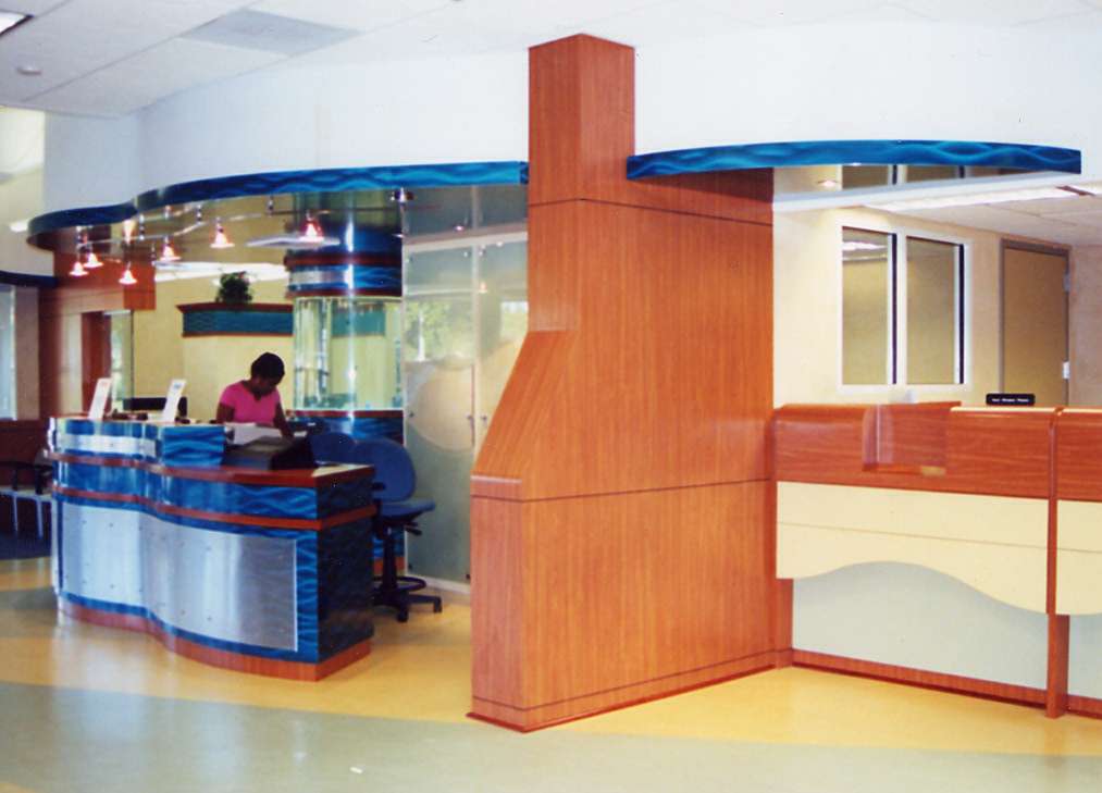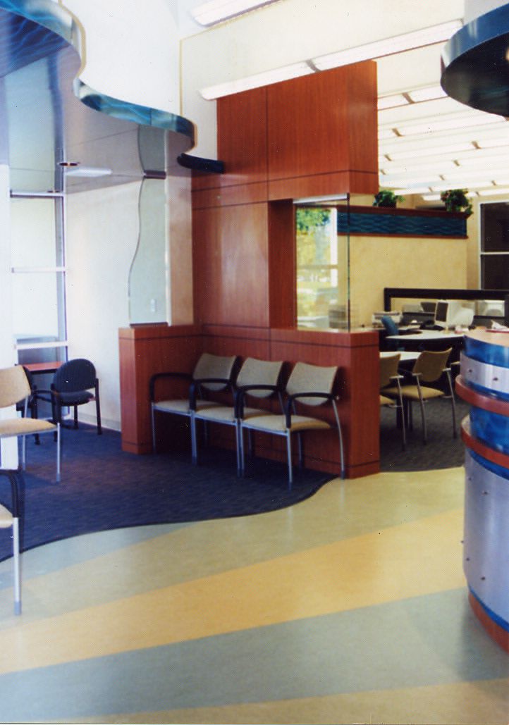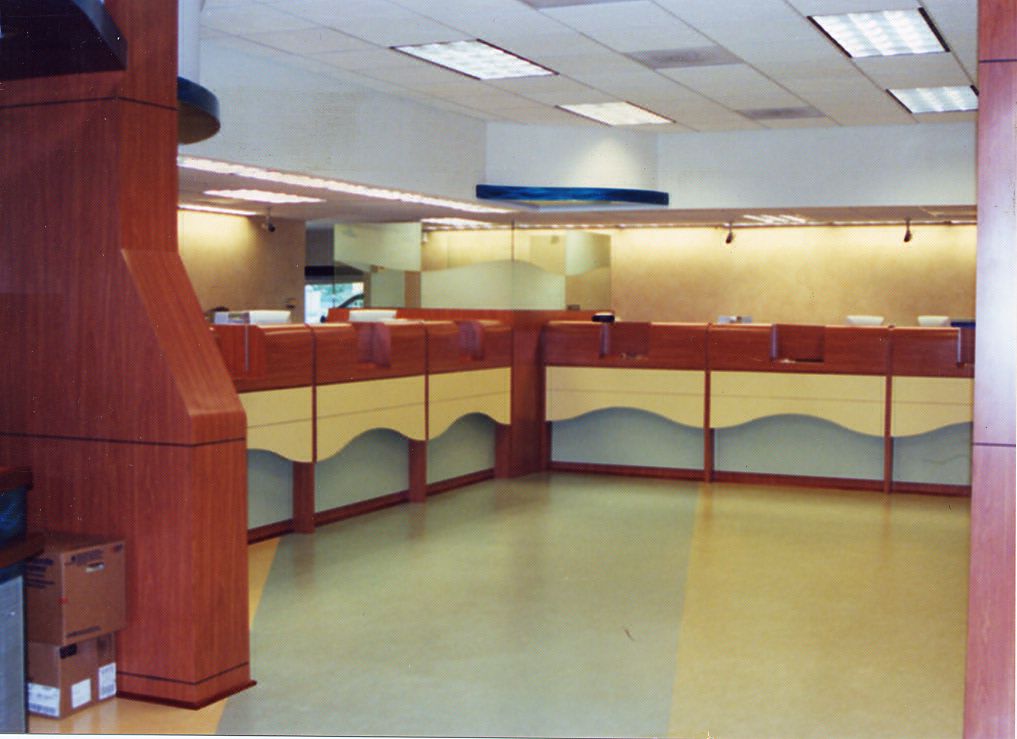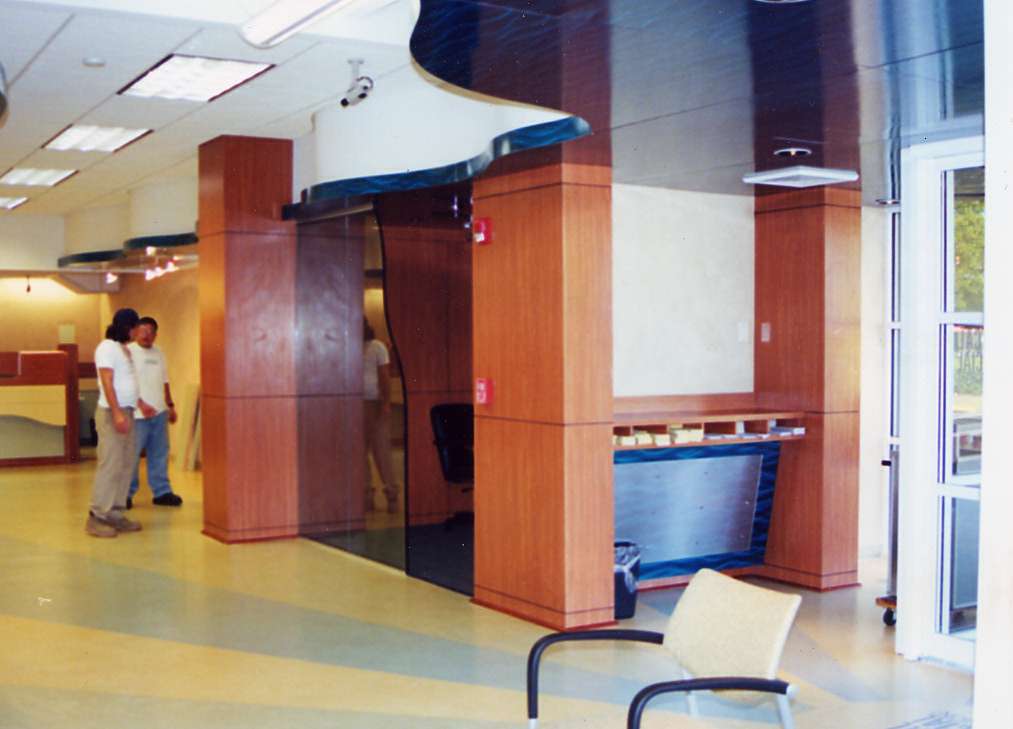 Plastic Laminate, wood veneer panels, cheery molding, stainless steel and lacquer finish blue steel panels