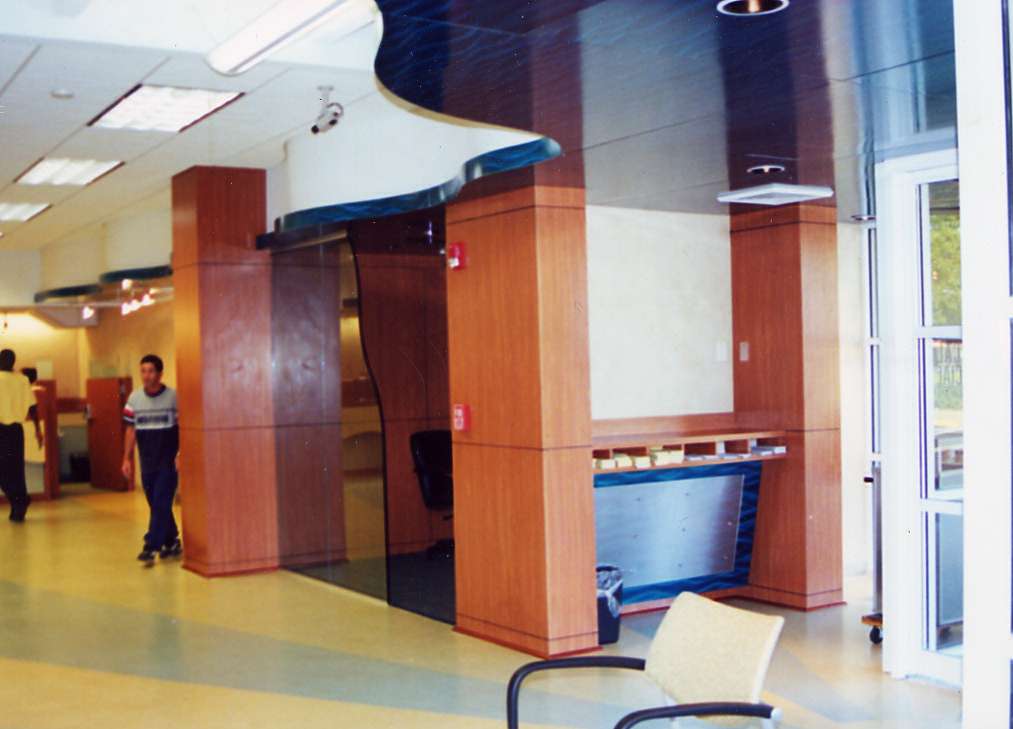 Plastic Laminate, wood veneer panels, cheery molding, stainless steel and lacquer finish blue steel panels
